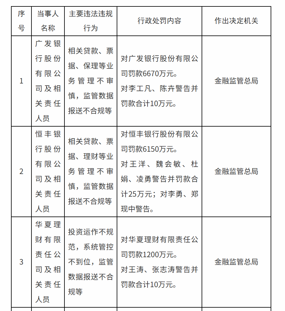 广发银行及相关责任人员因“相关贷款、票据、保理等业务管理不审慎,监管数据报送不合规等”,被金融监管总局罚款6670万元;对李工凡、陈卉警告并罚款合计10万元,机构与个人罚款合计6680万元。