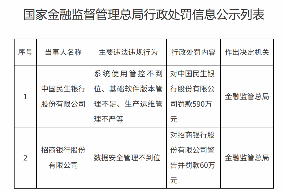 民生银行(600016)因“系统使用管控不到位、基础软件版本管理不足、生产运维管理不严等”违法违规行为,被金融监管总局处以590万元罚款。