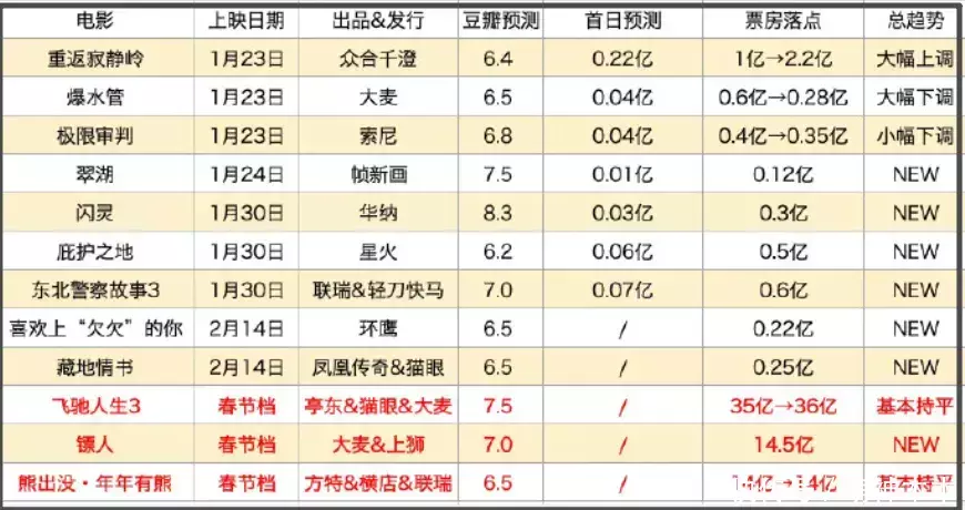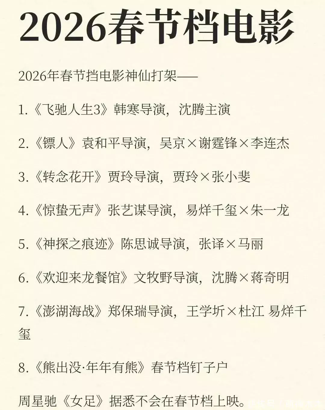 除了官宣的三部电影,还有消息称《转念花开》、《惊蛰无声》、《神探之痕迹》、《欢迎来到龙餐馆》、《澎湖海战》都有可能空降春节档。